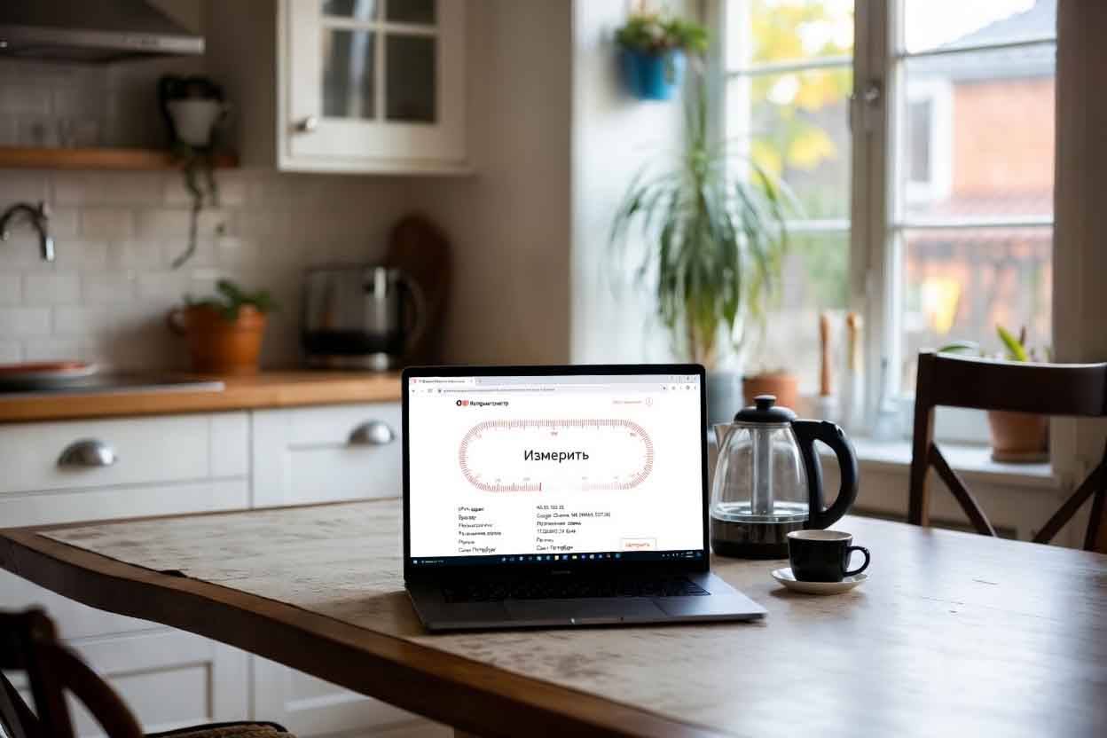 Подключите ноутбук или ПК по кабелю к роутеру, закройте фоновые загрузки и сделайте замер в нескольких сервисах проверки скорости интернета (например, Яндекс.Интернетометр или «Госуслуги»). Затем повторите измерение вечером: если показатели заметно отличаются по времени суток, это уже реальная картина, а не случайный результат.
